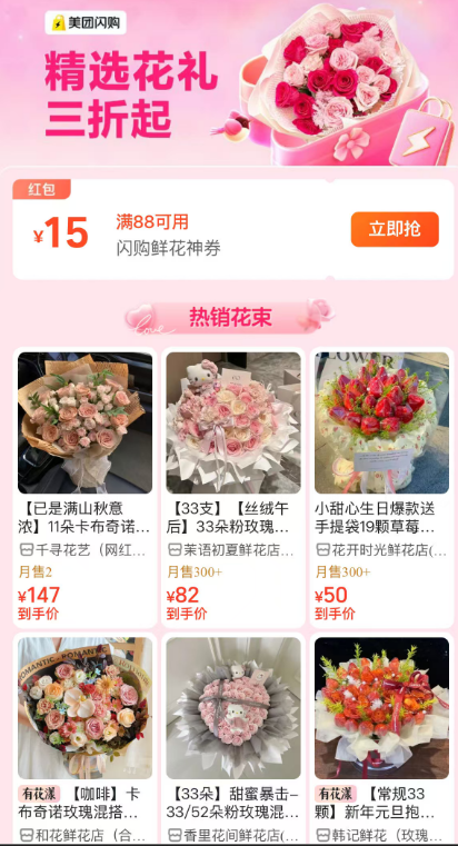 精选花礼三折起,领券88-15(老客)/58-12(新客)。