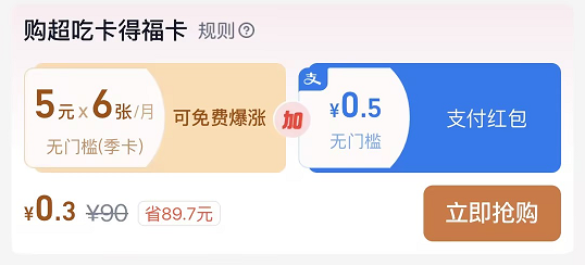 0.3元买闪购超吃季卡,另外赠送一张0.5元支付红包,相当于0元开卡!闪购6张5元无门槛红包!红包可以膨胀!领券绝对不吃亏!