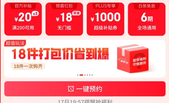 -PLUS超级补贴券、京喜自营买一送一、家纺真五折、白条6期免息、18元N件、18件N元