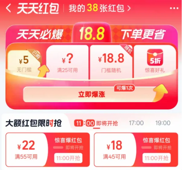 1、淘宝闪购红包天天领,大部分人可获得25-13/24-14/15-12/10-10/45-19/49-21等外卖券、同时还可领满36-18/46-23/60-30/88-44等大额5折夜宵红包,红包20-23点可用。同时夜宵会场——晚20点/21点/22点,还可抽取满18-18夜宵专属免单红包,