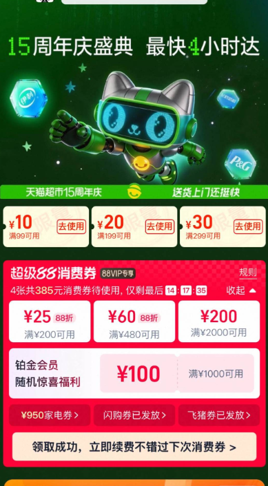 388VIP专享家电消费券3张共950元/闪购券包/飞猪券包铂金会员