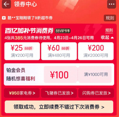 家电消费券3张共950元/闪购券包/飞猪券包铂金会员可额外领取满1000减100元钻石会员可额外领取满4000减400元黑钻会员可额外领取满8000减800元大家有需要的抓紧领取!